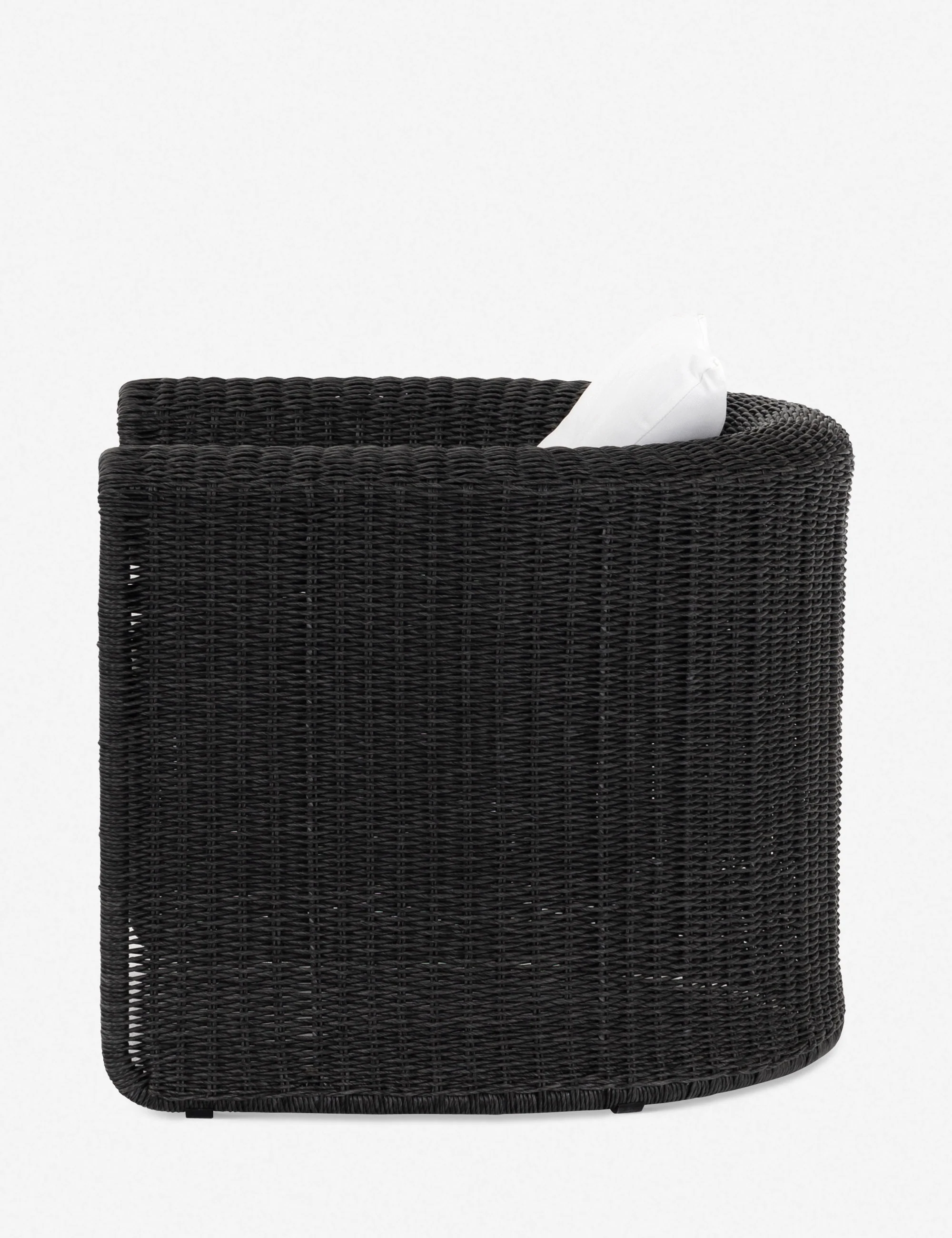 With its shapely, sling-like form, waterfall arm, and coal-colored finish, this accent chair is a nod to curvy seventies styling. Its all-weather wicker frame cradles durable tufted cushioning in a versatile white color palette. We love the idea of using this occasional chair to relax poolside, on your terrace, or even in your sunroom.